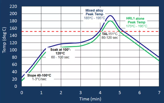 HRL1焊錫可以使峰值回流溫度低到185-190°C,使用SnAgCu焊錫球組裝的BGA封裝(即與SAC的混合焊點(diǎn)),或者使峰值回來(lái)溫度達(dá)到170-175℃,用于均質(zhì)HRL1焊點(diǎn)。